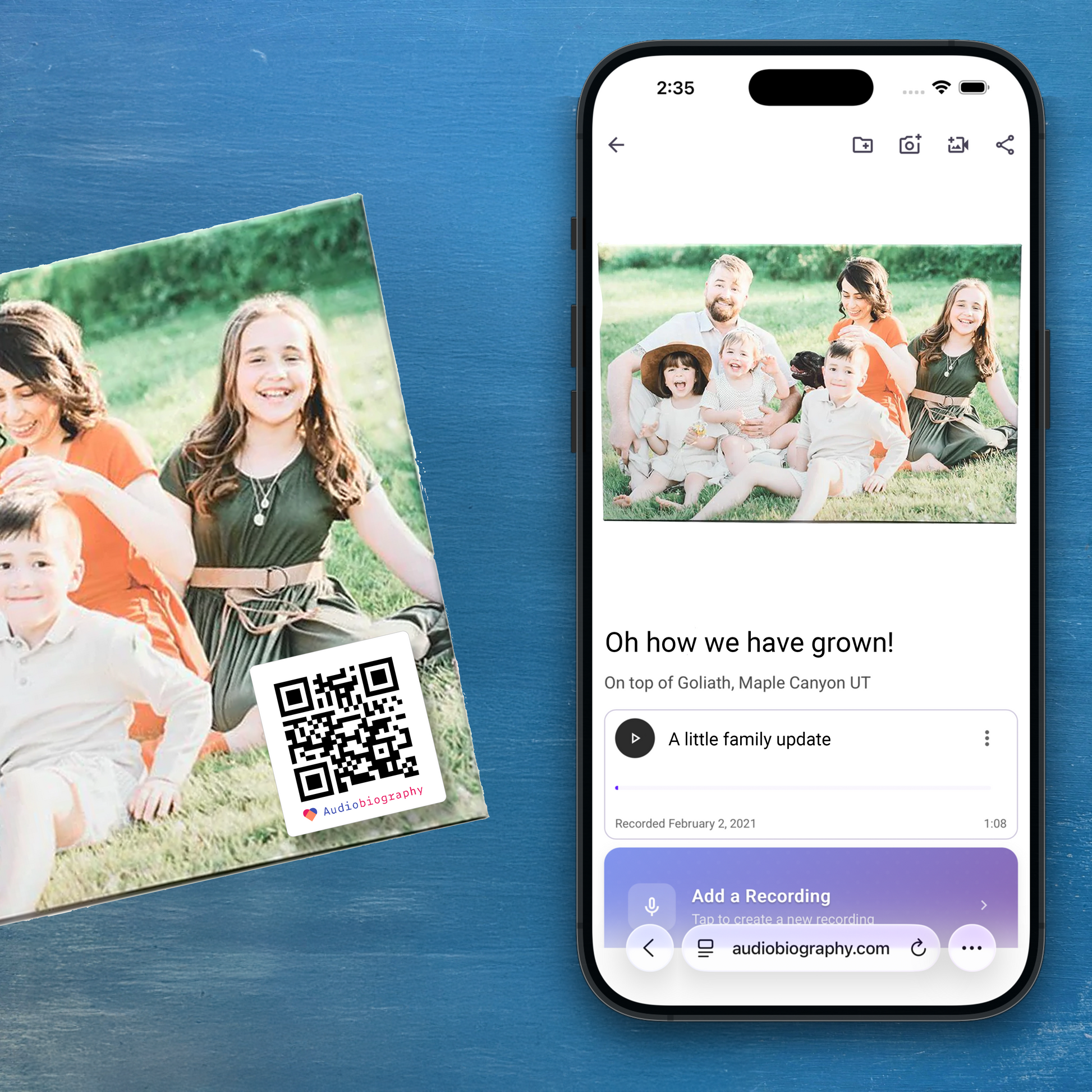 Record today, share forever. Audiobiography captures the life stories of those you love. It's easier than writing, beautifully personal, and guaranteed with no ongoing fees. This digital experience culminates in a printed book containing every transcription, every photo, and links to the original audio. Your first printed book is free.