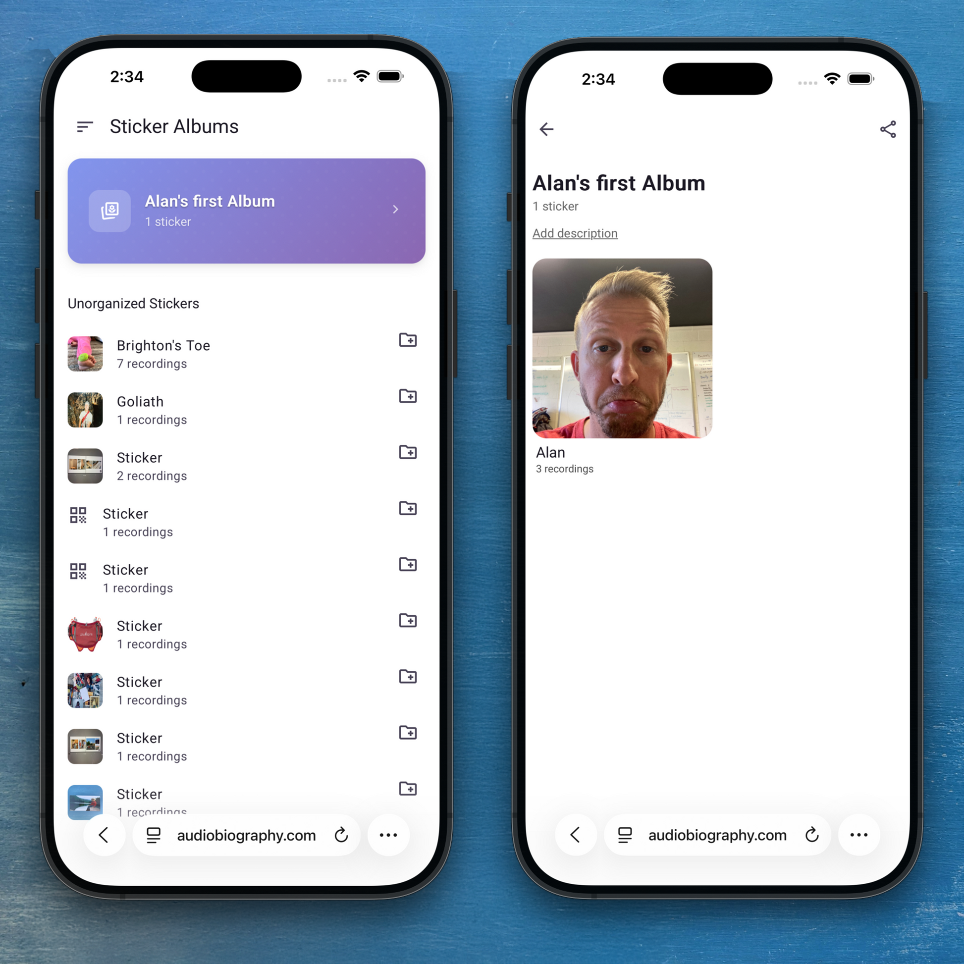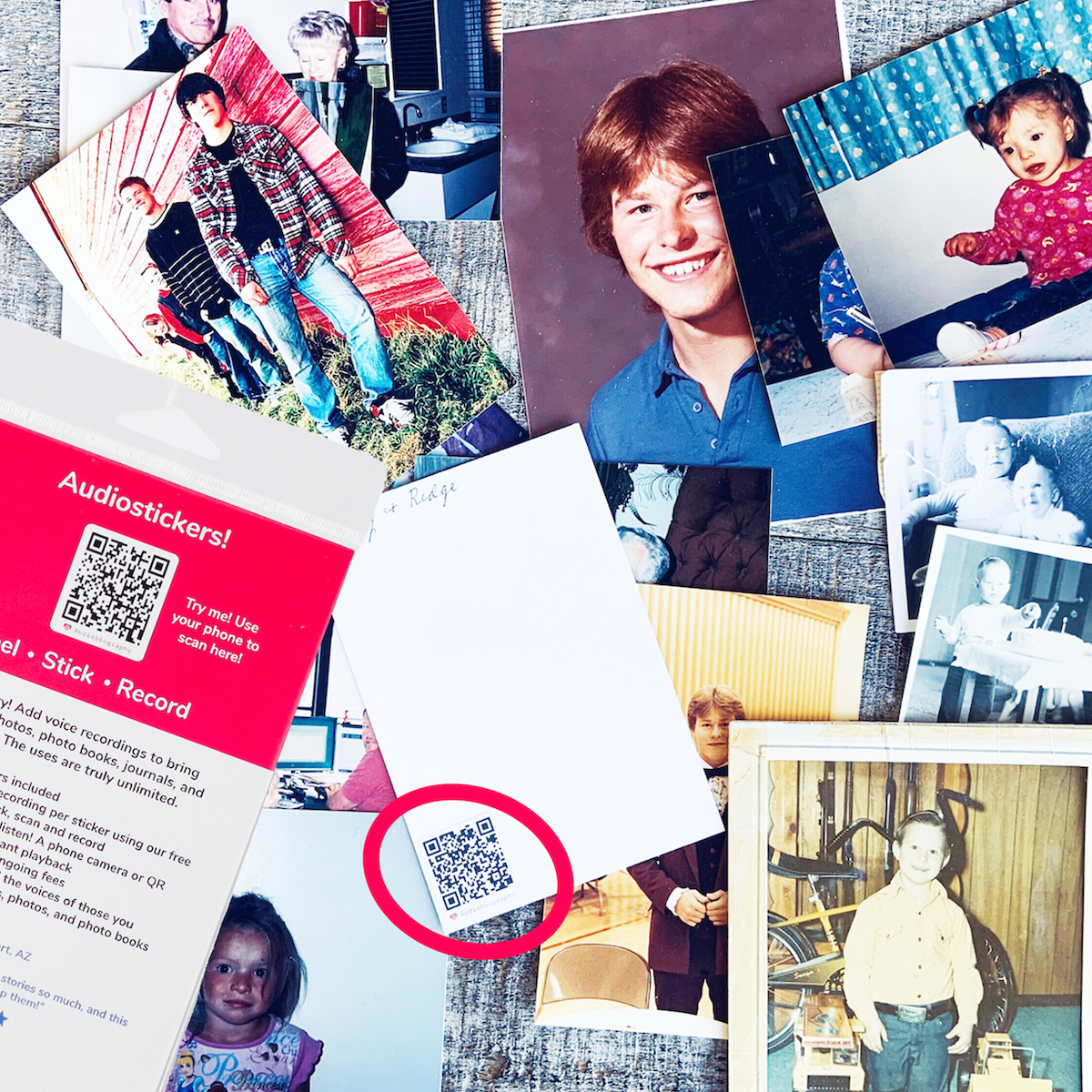 Transform your photo books, photos, journals, scrap books, kid’s books, greeting cards, recipe cards, letters, and anything else you can imagine, with Audiostickers. Just peel, stick, scan with your phone camera, and follow the link to tap record. Each sticker holds an unlimited amount of audio recording. Organize, delete, re-record, even add photos and video to the sticker to give more life to the story. Everything is stored and played back from the cloud, there are no subscriptions or ongoing fees, and you can download your own backup of the audio at any time. And did we mention? These stickers are water and tear resistant. You can confidently stick them to anything.